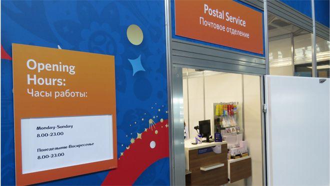 Сотрудники почтового пункта отмечают, что при всех современных возможностях общения, посетители медиацентра предпочитают подписывать и отправлять открытки своим родным. Самой востребованной почтовой карточкой в первые дни работы почтового отделения стала открытка с изображением русских валенок и надписью: «С любовью из России». Иностранные гости также с удовольствием приобретают коллекционные марки.На протяжении всего периода работы Международного вещательного центра посетители почтового отделения могут приобрести различные открытки, марки, филателистическую и сувенирную продукцию, посвященную мундиалю. В пункте Почты России работают сотрудники со знанием английского языка, которые помогают гостям центра отправить послания друзьям и знакомым в любую точку мира.