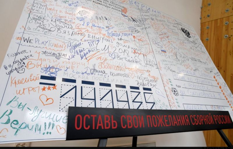 В шатре, который построили для пресс-конференций возле тренировочного поля сборной России в Новогорске, сегодня появился любопытный экспонат: гигантская почтовая открытка, исписанная пожеланиями национальной команде от болельщиков. Ее привезли из магазина технического спонсора РФС, где любой желающий мог написать все, чего желает сборной. Или все, что о ней думает.