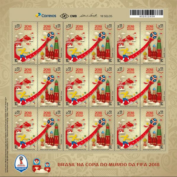 Марки выполнены в виде сцепки. Футбольное путешествие сборной Бразилии начинается в городе Ростове-на-Дону, проходя через Санкт-Петербург (на 1-й марке), далее в Москву (2-я марка), которая также является местом для третьей игры, и где будет проходить финальный матч. Наряду с символикой FIFA, на марках показан игрок, а под ним - тропа в сопровождении зеленых и желтых звезд, представляющих пять достижений - чемпионатов сборной Бразилии. Тропа ведет к шестой звезде, которую следует достичь в Москве.