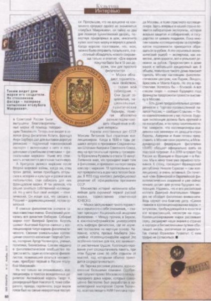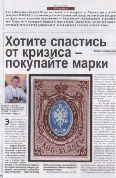 В журнале "Эхо планеты" за ноябрь 2008 года была опубликована статья-интервью с проф. Стрыгином А., который только вернулся из Парижа, где в штаб квартире Юнеско с огромным успехом прошла выставка, организованная двумя филателистическими Академиями - Российской и Всемирной.