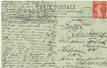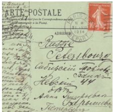 La carte postale française qu’ une femme russe (ses initiales nous sont parvenues: E. V. B. ) a envoyée en 1914 à sa Patrie, à Pétersbourg, est écrite dans un style élégant et un peu maniéré caracteristique de l’âge d’Argent. On peut deviner dans l’auteur de la carte postale une contemporaine raffinée d’Akhmatova, Blok, Goumilev. “J’ai depensé tout l’argent pour des gravures”,- écrit-elle à sa connaissance ou à sa parente Anna Grigorievna Barycheva. Et dans cette petite phrase on voit une personne qui n’est pas étrangère à l’art, qui l’aime.