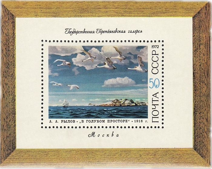 А.А. Рылов (1870-1939) — художник-пейзажист, был членом объединения «Мир искусства» и «Союза русских художников», ученик А.И. Куинджи. С 1915 года Академик живописи. Родился в Вятской губернии, учёбу продолжил в Санкт-Петербурге. Подробно о художнике А.А. Рылове можно прочесть в статье «Мастер пейзажа» на сайте Филателия.РУ. На почтовом блоке 1972 года показана его картина «В голубом просторе». Картина поступила в галерею от автора в 1919 году.
