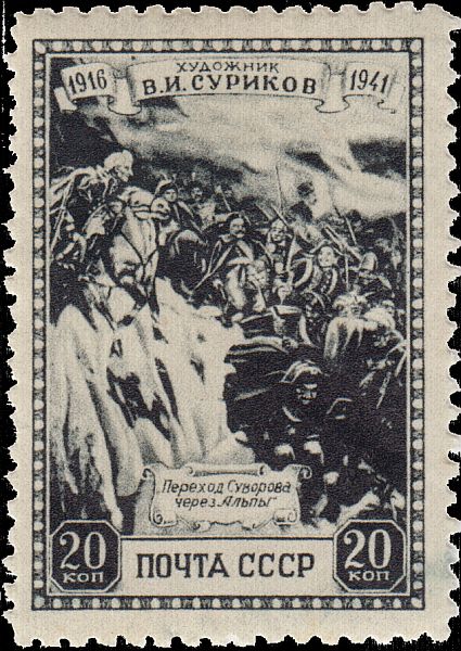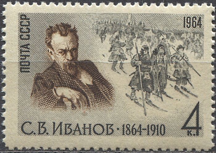 В конце 19-го века он обращается к исторической живописи. К этому периоду его творчества относится картина «Поход московитян. 16-й век», которая показана на марке, посвящённой 100-летию со дня рождения художника. Картина рассказывает о зимних походах Московского войска при Иване Грозном. Художник стремился показать силу и мужество участников похода. На картине заметно влияние Сурикова на творчество С.В. Иванова. Сравните картину В.И. Сурикова «Переход Суворова через Альпы» с картиной С.В.Иванова и вы убедитесь в этом.