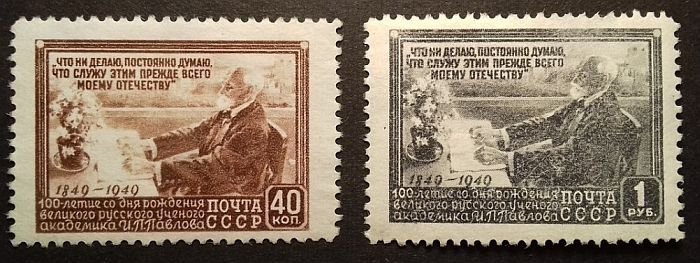 В 1949 году отмечалось 100-летие со дня рождения академика, физиолога И.П. Павлова. В связи с юбилеем были выпущены две марки с его портретом работы М.В. Нестерова. Художник показал учёного во время его оживлённой беседы.