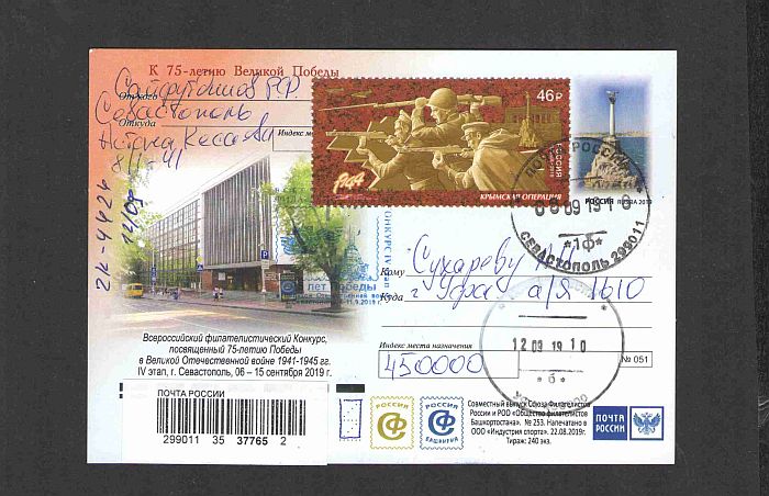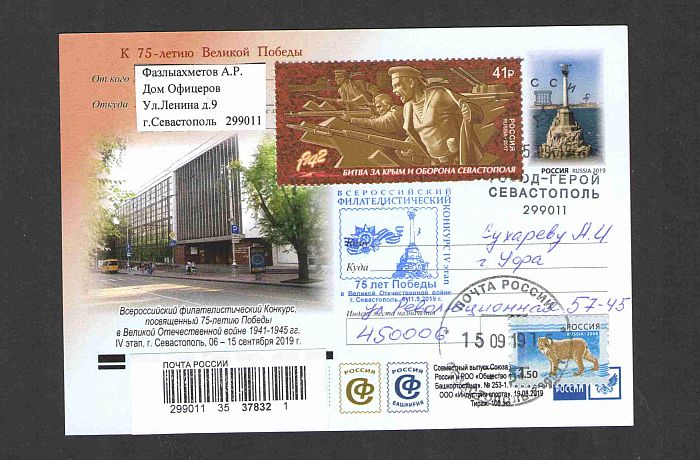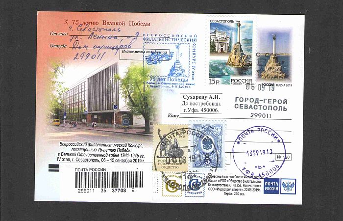 В этой статье представлены почтовые карточки Союза филателистов России и РОО «Общество филателистов Башкортостана» из коллекции автора о Всероссийском филателистическом Конкурсе, посвящённом 75-летию Победы в Великой Отечественной войне 1941-1945 гг. (IV этап), проходившем в г. Севастополе с 6 по 15 сентября 2019 г.