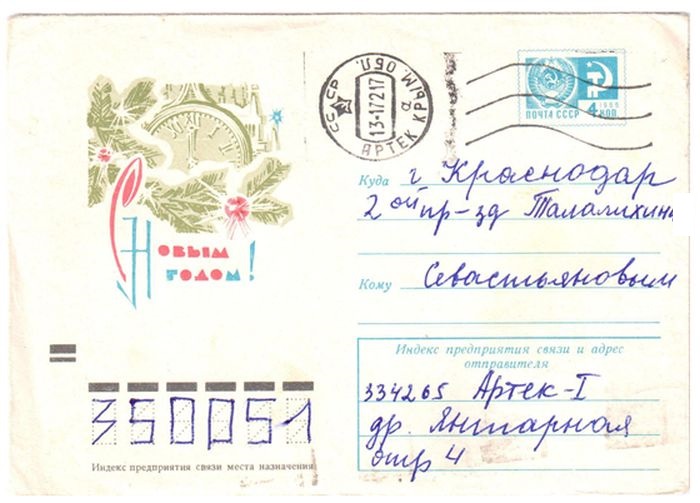 «Здравствуйте дорогие мама, папа и Миша. Долго не писал, времени не было, а теперь всё по порядку. 6 января мы приехали в «Артек» (правда организация в «Орленке» была лучше). 7 января был вечер знакомства. 8-9 января был оргсбор отряда и дружины. Был выбран членом совета дружины — отв. за пресс — центр. 10 января в 12.00 открытие I лагерной смены в 1972 году, 50-летие пионерской организации. 12 января были кружки (записался в фото, выбрали старостой). Началась школа, я в 7 ”А”. 12 января наш 4 отряд дежурил (поднимал флаг). Часто ходим к морю.Извините, что пишу плохо, спешу. 13/I -172 г. Ваш Ваня. Присылайте письмо. Пишите».