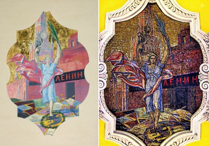 Чередуя эскизы и существующие ныне мозаики, позвольте показать, насколько схожи даже движения ступней женщины, символизирующей мир и Родины-матери. Скорее всего, такое сходство Корин придал своим героиням в качестве смыслового рефрена, тем более что станции, на которых эти мозаики помещены, разделяют только Достоевская и Проспект Мира-кольцевая.