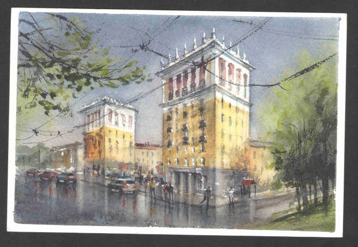 ПК без №. Дарья Митта. Уфа. Здания восьмиэтажек. Акварель. 2017. © Opex, www.opex.spb.ru Двусторонняя. Открытка прошла почту.