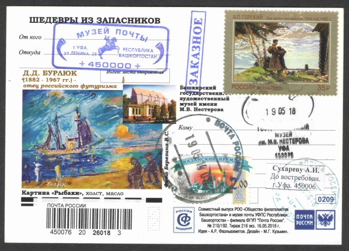ПК № 210. Шедевры из запасников. Д.Д. Бурлюк (1882-1967). Рыбаки. 16 мая 2018 г. Тир.: 216 экз. Номерная. На почте художественная марка (м., мм.) погашена спецштемпелем (СШ) «Государственный музей им. М.В. Нестерова» доплатные мм. - обычным календарным штемпелем (КШ). На ПК – логотипы Общества филателистов Башкирии (ОФБ) и АО «Почта России».