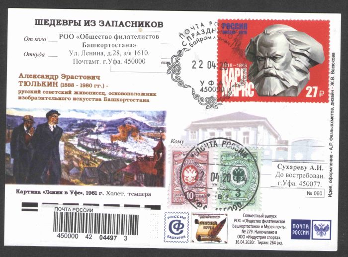 ПК № 279. Шедевры из запасников. А.Э. Тюлькин (1888-1980). Ленин в Уфе. 16 апреля 2020 г. Тир.: 264 экз. Номерная. На почте художеств. м. погашена СШ-лем «Почта России С праздником! Уфа 450000 22 04 20», доплатные мм. - обычным КШ-лем. На ПК – дом-музей Тюлькина, логотипы ОФБ и АО «Почта России».