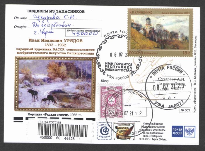 ПК № 292. Шедевры из запасников. И.И. Урядов. (1893-1962). Редкие гости. 30 июня 2021 г. Тир.: 104 экз. Номерная. Карточка прошла почту. «Следы» на ней почтовых отделений оставлены такие же, как и на предыдущей ПК.