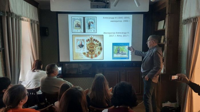 Алексей Анатольевич продемонстрировал красочную презентацию «История России. Династия Романовых на почтовых марках», сделав таким образом отсылку к прошедшим накануне «Х Ольденбургским чтениям» — ежегодной научной конференции, на которой в этом году впервые была введена секция филателии и филокартии.
