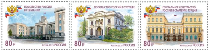 Здания дипломатических представительств России за рубежом изображены на почтовых марках.