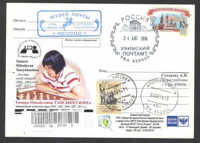 ПК № 163. Т.М. Тансыккужина – шашистка, пятикратная чемпионка мира. 15 августа 2016 г. Тир.: 520 экз. Карточка прошла заказную почту. Основная марка (м.) на ней погашена постояннодействующим спецштемпелем (СШ) «Россия Уфимский почтамт Уфа 450000 24 авг 2016». Доплатная м. – обычным календарным штемпелем (КШ).