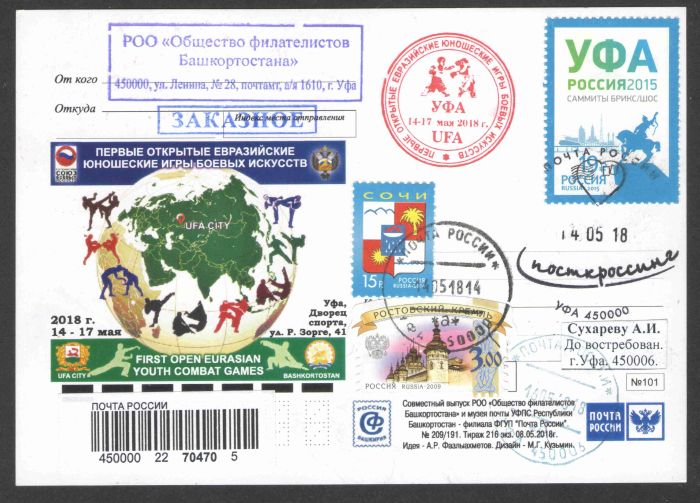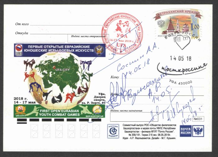ПК № 209. Первые открытые Евразийские юношеские игры боевых искусств в Уфе. 8 мая 2018 г. Тир.: 216 экз. Номерная. Карточка прошла заказную почту. Основная м. на ней погашена СШ-лем о посткроссинге. Доплатные – КШ-лем. Проставлено тематическое каше. На обороте стоит оттиск каше с ошибкой: вместо «искусств» сделано «исскуств».