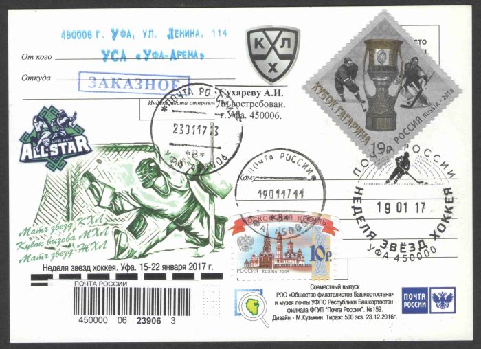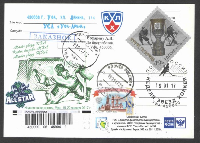 ПК № 174. Все звёзды хоккея в Уфе. 29 ноября 2016 г. Тир.: 500 экз. Карточка прошла заказную почту. Основная м. на ней погашена СШ «Почта России Неделя звёзд хоккея Уфа 450000 15 01 17». Доплатная м. – КШ-лем.