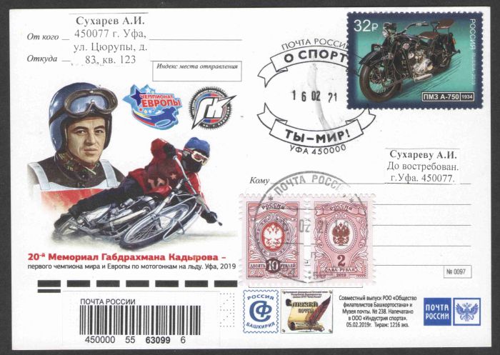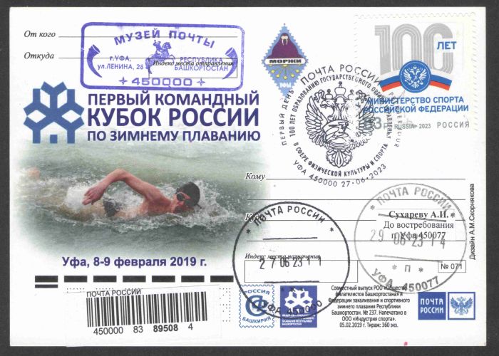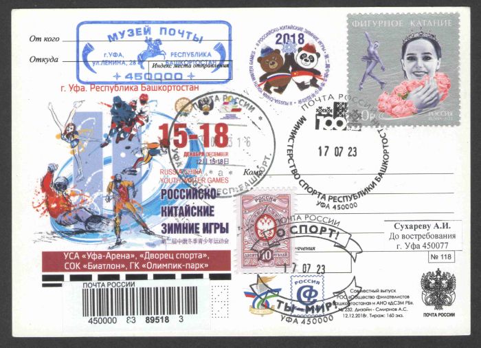 ПК № 232. Уфа. Российско-китайские зимние игры. На заказной карточке СШ «Почта России Министерство спорта Республики Башкортостан 100 лет Уфа 450000 17 07 23». Доплат. мм. — СШ-лем «Почта России О спорт, ты — мир!» и КШ-лем этой же даты.