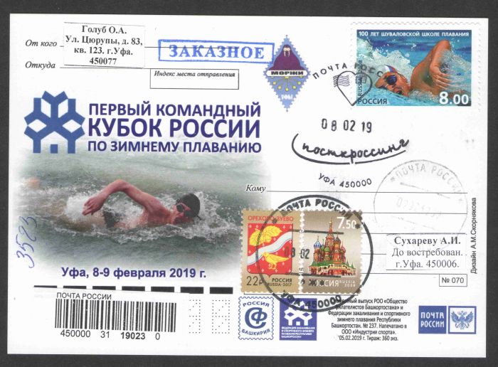 ПК № 237. Первый командный кубок России по зимнему плаванию. 5 февраля 2019 г. Тир.: 360 экз. Номерная. Основная м. погашена СШ-лем о посткроссинге. Доплатные мм. – КШ-лем.