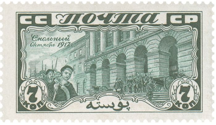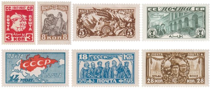 В следующий раз специальным почтовым выпуском была отмечена 10-я годовщина Октябрьской революции. Серия из 7 марок была выпущена 1 октября 1927 года. Над ней работали сразу 6 художников.