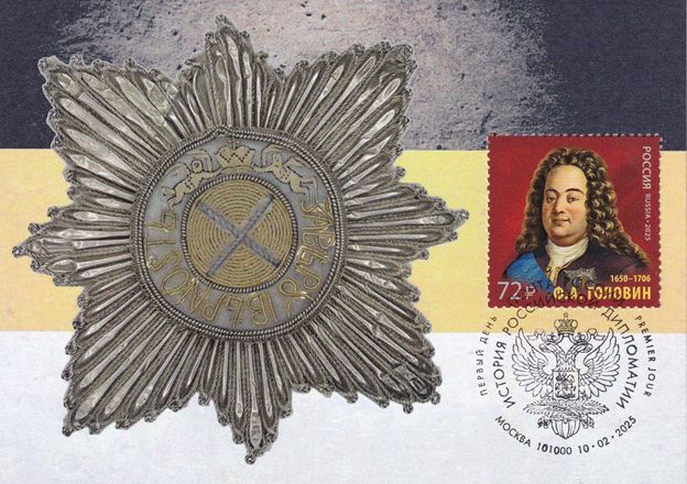 Картмаксимум к юбилею Ф.А. Головина. На груди Орден Андрея Первозванного №1. После консультации с музейными работниками, выяснилось, что первые ордена были не металлические, а тканные: вышивались прямо на мундире (камзоле).