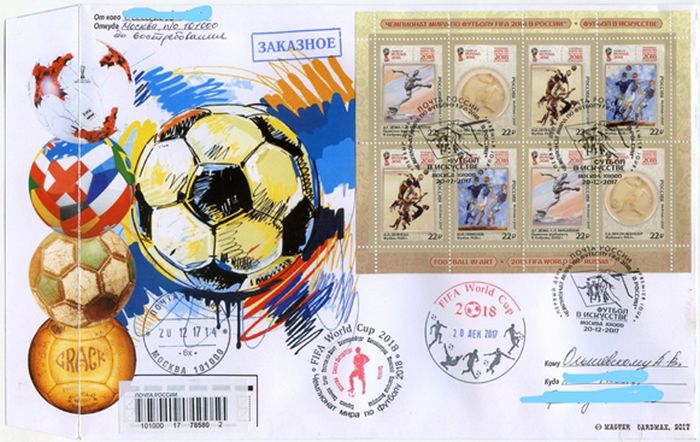 На последнем конверте «Футбол-2018» стоят 2 каше, непочтовые гашения, тоже делал сам. Каше в несколько цветов.