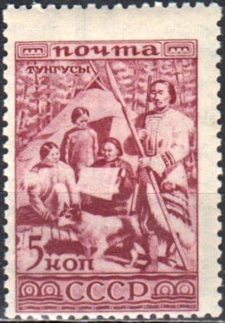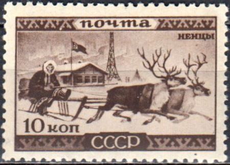 В 1933 году выходила серия марок «Народы СССР». На марках достоинством 5 и 10 копеек показаны тунгусы (эвенки) и ненцы. Они же показаны на сцепке.
