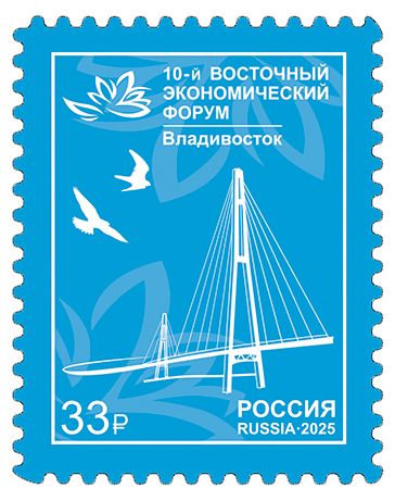 На почтовой марке изображены Русский мост в городе Владивостоке и символика Восточного экономического форума.