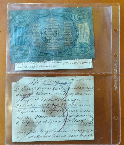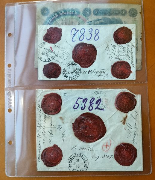 На скане также показан российский банковский кредитный билет конца XIX в. номиналом в 5 рублей и опечатанные сургучом обороты конвертов.