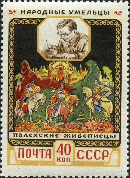 Впервые почтовая марка, посвящённая Палеху, была выпущена в 1958 году.