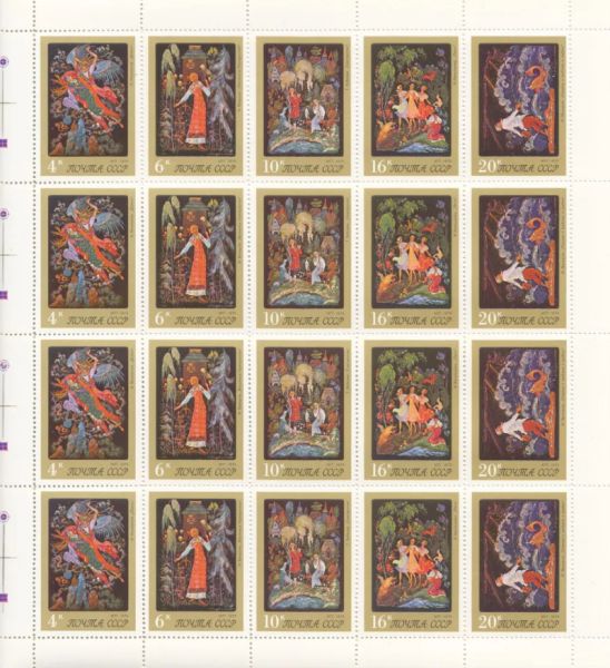 Искусство Палеха на почтовых марках 1976 года. Характеристика: офсет на мелованной бумаге с лаковым покрытием. Тираж 6,3;5,3;5,0;4,2;3,4.