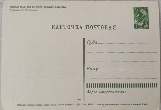 На конверте изображено озеро Большое Миассово, которое будет упомянуто в статье ещё раз.