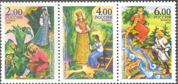 №912 – 914, 2004 г. Сказы П.П. Бажова. К 125-летию со дня рождения П.П. Бажова (1879-1950), писателя. Художник – Федотова А.