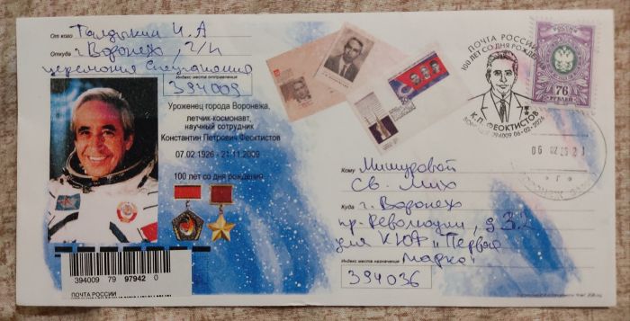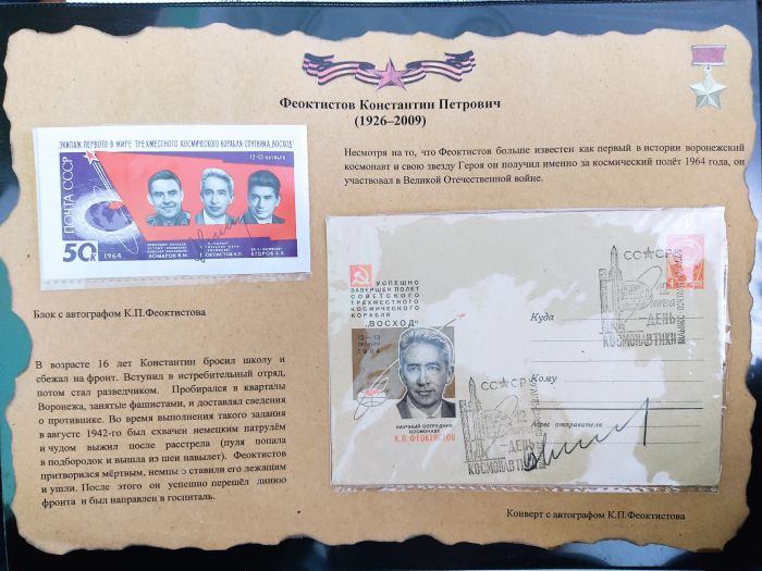 «Изюминкой» доклада стала демонстрация конверта и почтового блока с подлинными автографами Константина Петровича Феоктистова, которые он оставил на филателистических материалах при посещении воронежского общества филателистов в 1960-е годы.