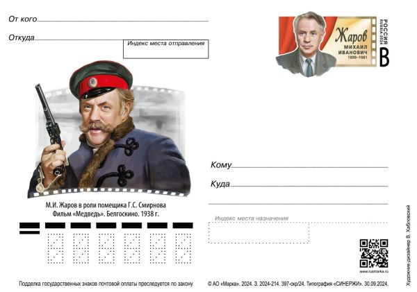 В 2024 году АО «Марка» к 125-летию актёра выпущена почтовая карточка с оригинальной маркой. На оригинальной марке изображён портрет М.И. Жарова; на основной иллюстрации — кадр из фильма «Медведь» (1938) Белгоскино.