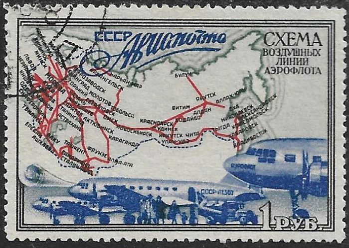 Разглядели схему пассажирских перевозок на марке из серии 1949 года? Что за крайние точки на карте: Булун и Аллах-Юнь? Зачем в эти «края Земли» протянулись маршруты скромно развитой в те годы советской авиации?