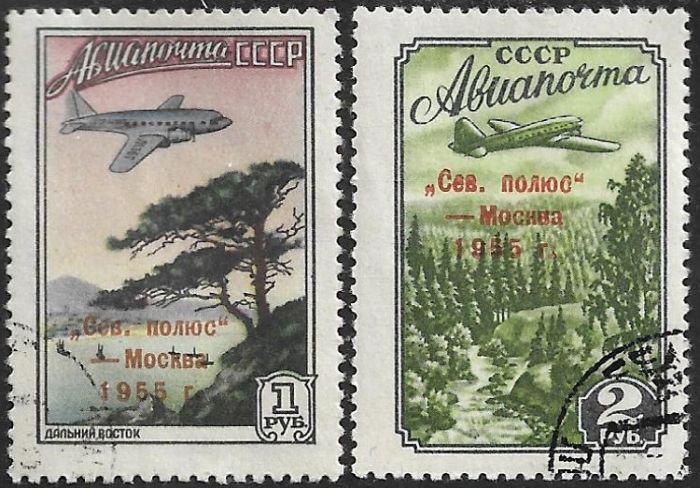 На этих марках тоже Ил-12, а надпечатка — в связи с доставкой на льдину очередной экспедиции «СП-5».