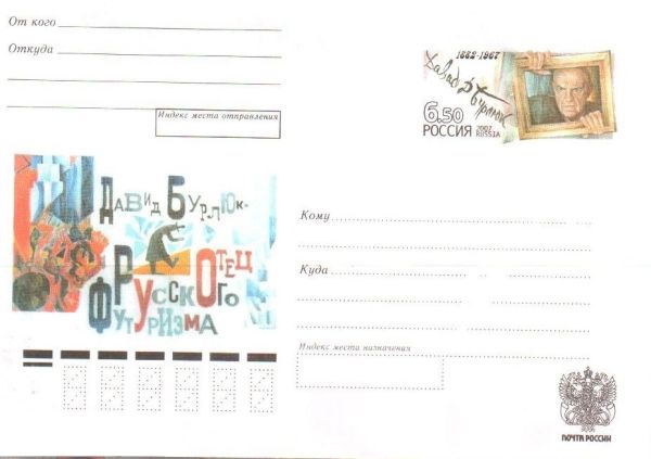 Давид Давидович Бурлюк (1882-1967) — поэт, художник, соратник В.В. Маяковского. Один из авторов знаменитого манифеста «Пощёчина общественному вкусу». В манифесте призывалось «сбросить Пушкина, Достоевского, Толстого и проч. и проч. с Парохода Современности». С 1920 года в эмиграции. Неоднократно посещал Советский Союз. В 2007 году, в связи со 125-летием со дня рождения Д.Д. Бурлюка, вышел конверт с оригинальной маркой. Художник Ю.Арцименев.
