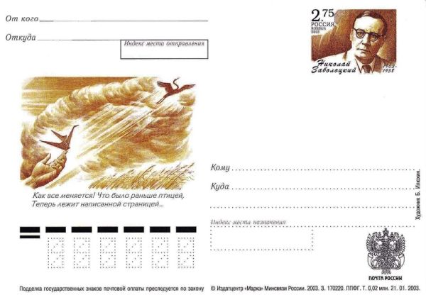 В 2003 году, в связи со 100-летием со дня рождения Н.А. Заболоцкого, вышла карточка с оригинальной маркой.