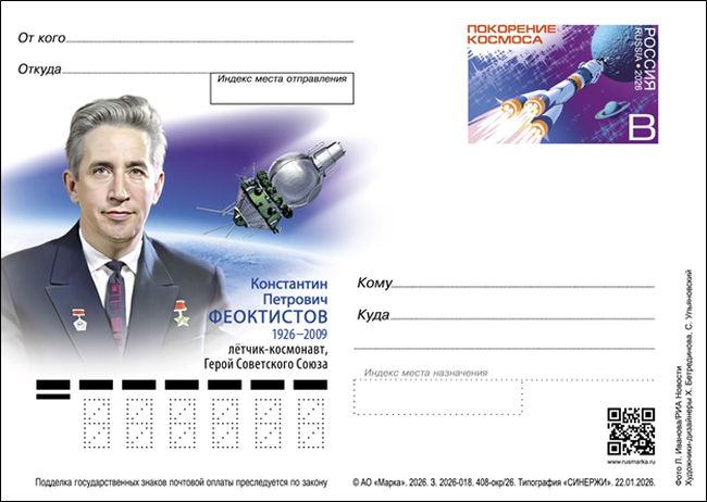 № 408/окр. Серия «Покорение космоса». 100 лет со дня рождения К.П. Феоктистова (1926–2009), лётчика-космонавта, Героя Советского Союза. Фото (РИА Новости) – Иванов Л. Художник-дизайнер (марка) – Ульяновский C. Художник-дизайнер (иллюстрация) – Бетрединова Х.