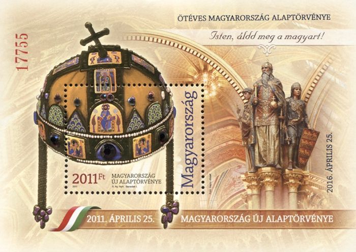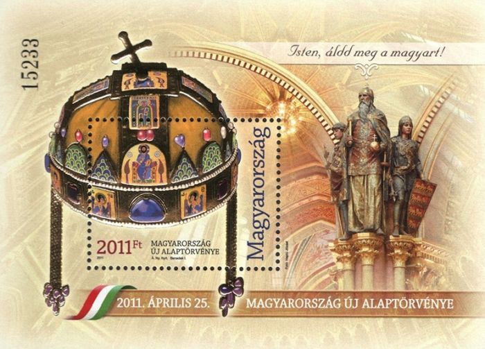 В 2011 году, в честь принятия новой конституции, почта Венгрии презентовала номерной почтовый блок с изображением короны Святого Иштвана (Святая корона Венгрии) — традиционной короной венгерских королей и одним из главных символов венгерской государственности, сводами купольного зала здания парламента со статуей короля Святого Иштвана. Корона напечатана с использованием 23-каратного золота и украшена стеклянными кристаллами.