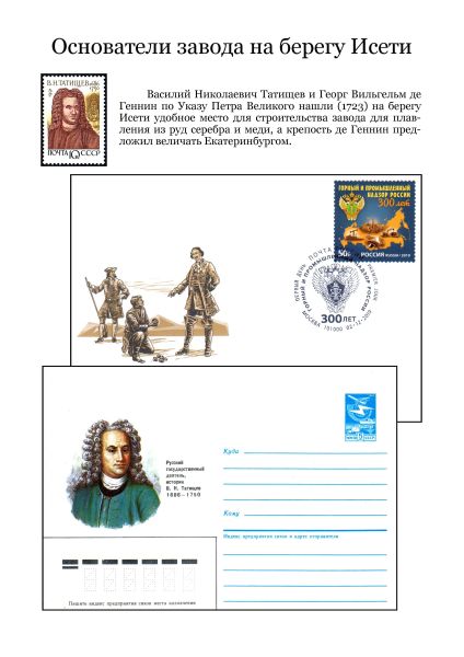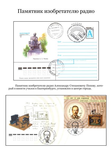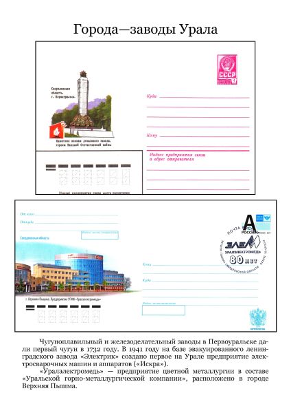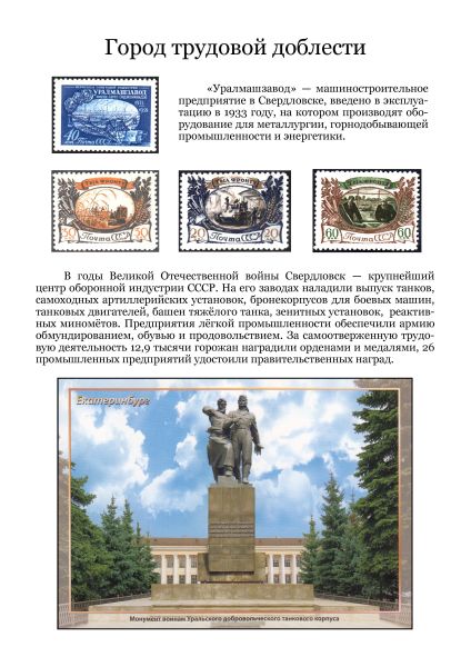 Он пишет: «С огромным удовольствием познакомился с работами филателиста Михаила Антоненко «Путешествие в Миасс» и «ГРЦ имени академика В.П. Макеева». Спасибо, коллега! Продолжая разработку темы «Филателистическое краеведение» представляю на суд филателистов небольшую коллекцию, посвящённую городам и людям Екатеринбуржья».