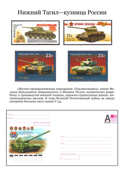 «Научно-производственная корпорация «Уралвагонзавод» имени Феликса Эдмундовича Дзержинского» в Нижнем Тагиле, осуществляет разработку и производство военной техники, дорожно-строительных машин, железнодорожных вагонов. В годы Великой Отечественной войны на заводе построена большая часть танков Т-34.