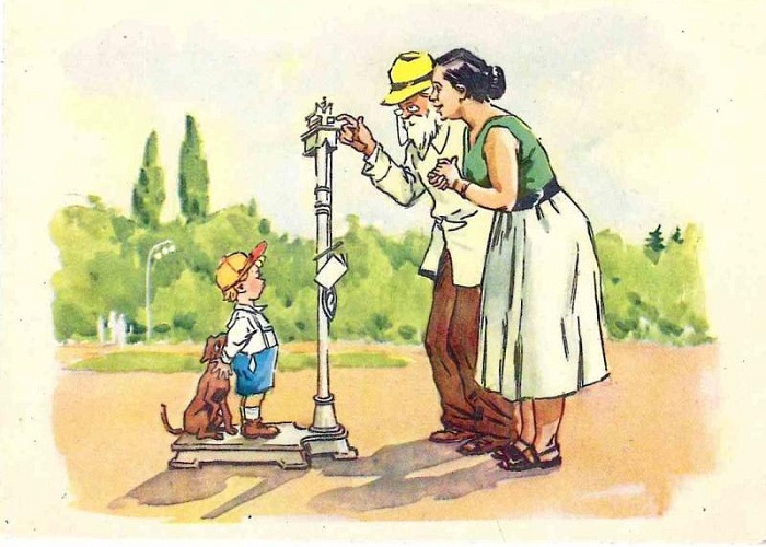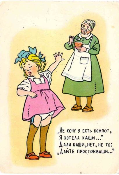 Нельзя не отметить на открытках и главную суперспособность любого ребенка: умение свести взрослых с ума своими «хочу» и «не хочу». Здесь бабушка попала в оборот к маленькой капризуле. А открытка художника Генриха Валька к тому же здорово показывает бытовые детали советской жизни, вроде детских чулок на подвязках. В 1956 году, когда была нарисована эта открытка, колготок еще нет, а чулки носят и девочки, и мальчики.