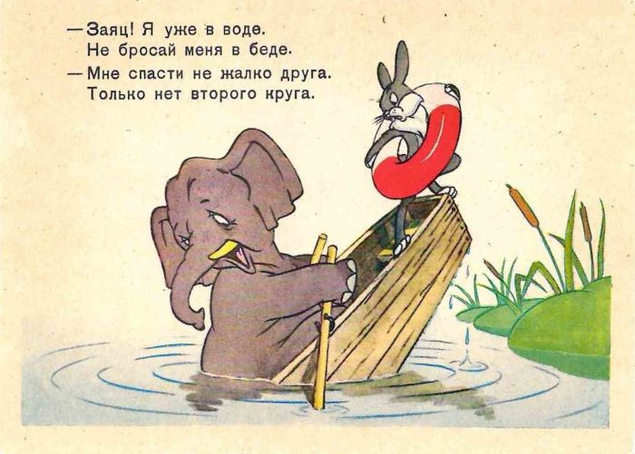 Героями юмористических открыток могут стать не только люди, но и животные. При этом комические ситуации, в которые они попадают, нисколько не проще. Можно посмеяться и над оправданиями зайца, и над слоном, который своим весом потопил лодку. Хотя если отбросить юмор, придется довольно долго размышлять, чего стоит дружба зайца, может ли его крошечный круг спасти слона и как героям выпутаться из этой ситуации.