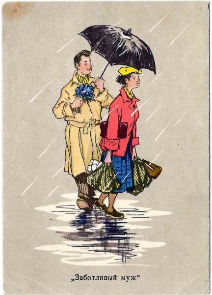 Среди советских открыток тоже много ироничных, сатирических. На первый взгляд может показаться, что в семейной паре всё в порядке: у мужа в руках букетик цветов, он заботливо держит над женой зонт. Однако почти сразу замечаешь десяток сумок, которые женщина несёт одна.