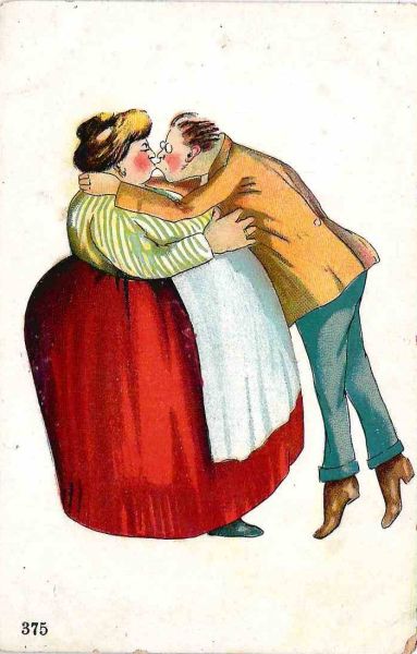 Но лучший юмор — тот, в котором есть нота теплоты и симпатии. Эта открытка, кажется, смеется над округлыми формами женщины: даже любящий муж не может дотянуться до ее губ, чтобы поцеловать. Но пара, сохранившая нежность в отношениях, даже в смешном ракурсе очаровательна. А домовитая, но не без кокетства наряженная супруга определенно демонстрирует, что красота и любовь зависят не только от возраста и килограммов.