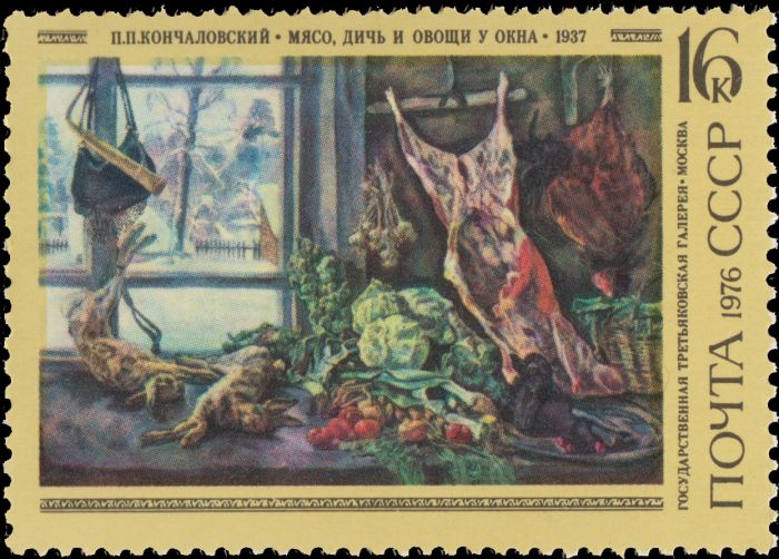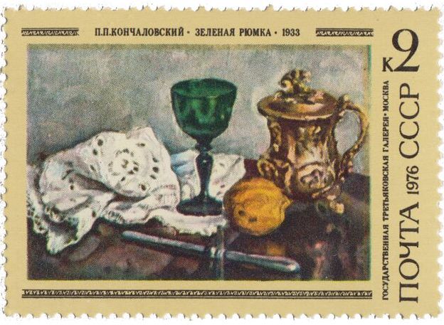 Затем последовала серия из пяти марок, знакомящая филателистов с картинами Кончаловского, выполненными в разных жанрах (марки вышли в 1976 г.). Филателисты познакомились с картинами «Зеленая рюмка», «Возвращение с ярмарки», «Дичь и овощи у окна».