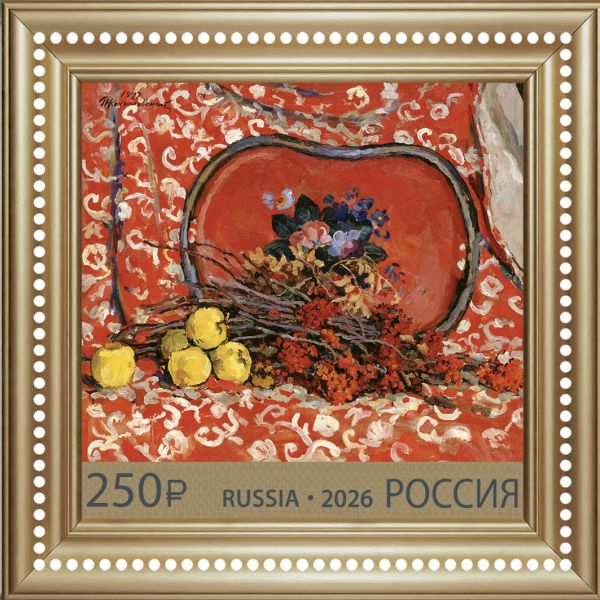 Мы убеждаемся, что наследие художника хорошо освоено маркоиздателями. И вот перед нами блок, выпуск которого приурочен к юбилейной дате. Номинал блока 250 рублей. На почтовой марке изображена картина П.П. Кончаловского «Натюрморт. Красный поднос и рябина» (1947, Фонд Петра Кончаловского). Марка имеет квадратную форму. Перфорация размещена по периметру роскошной позолоченной рамы.