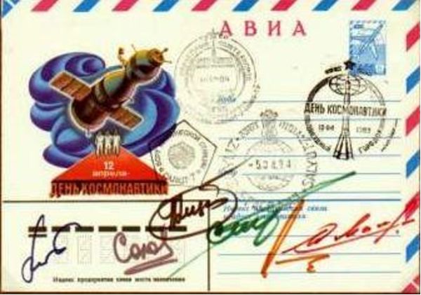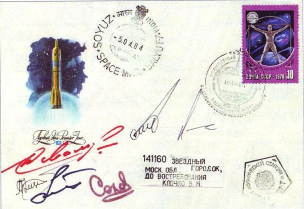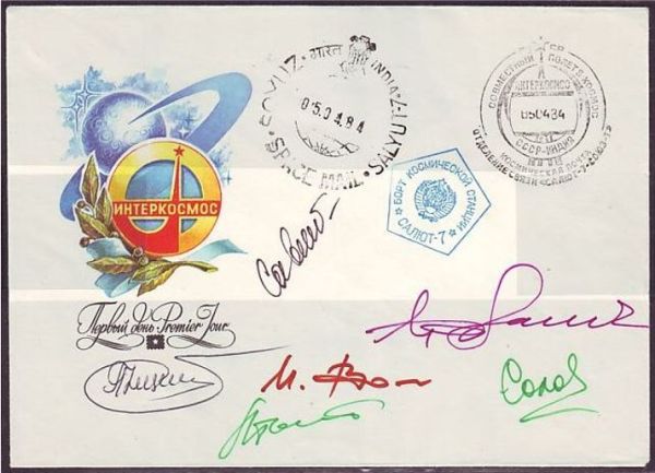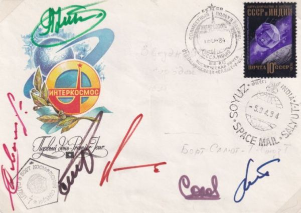 Бортовой конверт с автографами всех космонавтов и с гашением «-5.04.84.» на индийском штемпеле космической почты. Из коллекции автора.