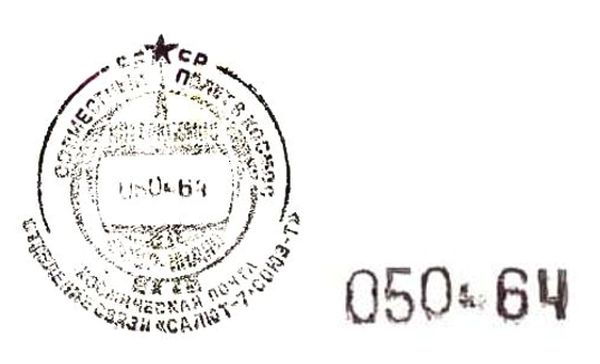 Экспедиция посещения СССР-Индия доставила на станцию почтовый штемпель СССР с переводной датой и текстом по окружности «СОВМЕСТНЫЙ ПОЛЕТ В КОСМОС. СССР-ИНДИЯ. ИНТЕРКОСМОС. КОСМИЧЕСКАЯ ПОЧТА. ОТДЕЛЕНИЕ СВЯЗИ «САЛЮТ-7-СОЮЗ-Т». На рисунке условное изображение стартующей ракеты на фоне орбиты.
